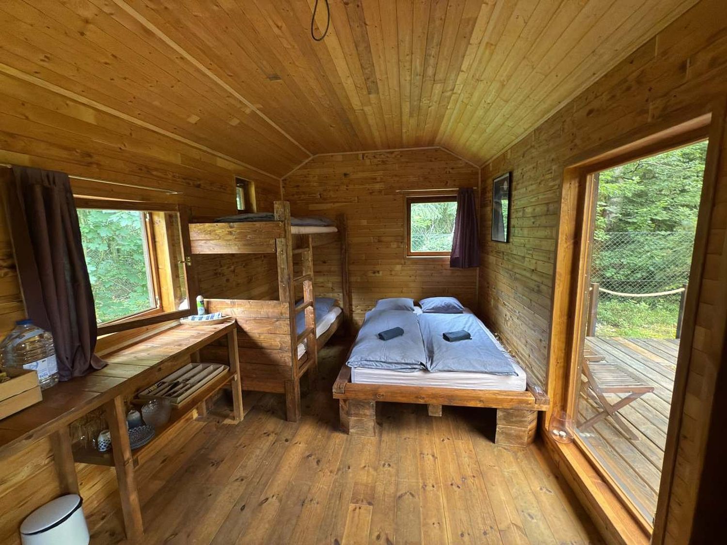 Inside the cottage, there is a double bed and a bunk bed. There is a kitchenette for preparing meals. Basic kitchen utensils are provided. There is also a dry toilet inside, but you can also use the eco-friendly outhouse on the property. Bottled water will be available in the cottage.