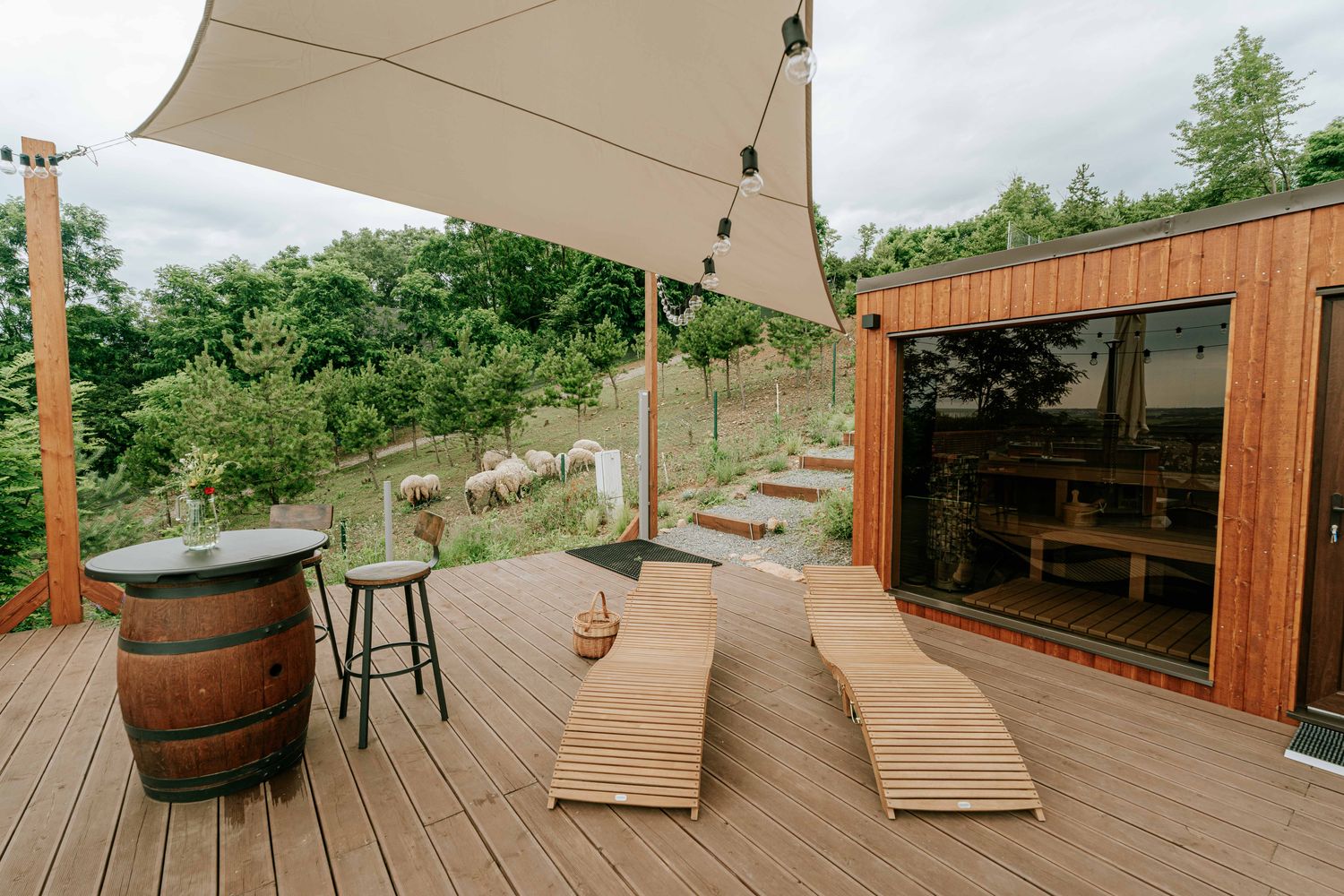 Naše ubytování je elegantně zařízené a disponuje velkou terasou, kde si můžete užít snídani s panoramatickým výhledem nebo večerní klid s láhví vína pod hvězdnou oblohou. Okolní louky jsou domovem pro naše přátelské ovečky, které se zde volně pasou a přidávají dojem autentického venkovského života.