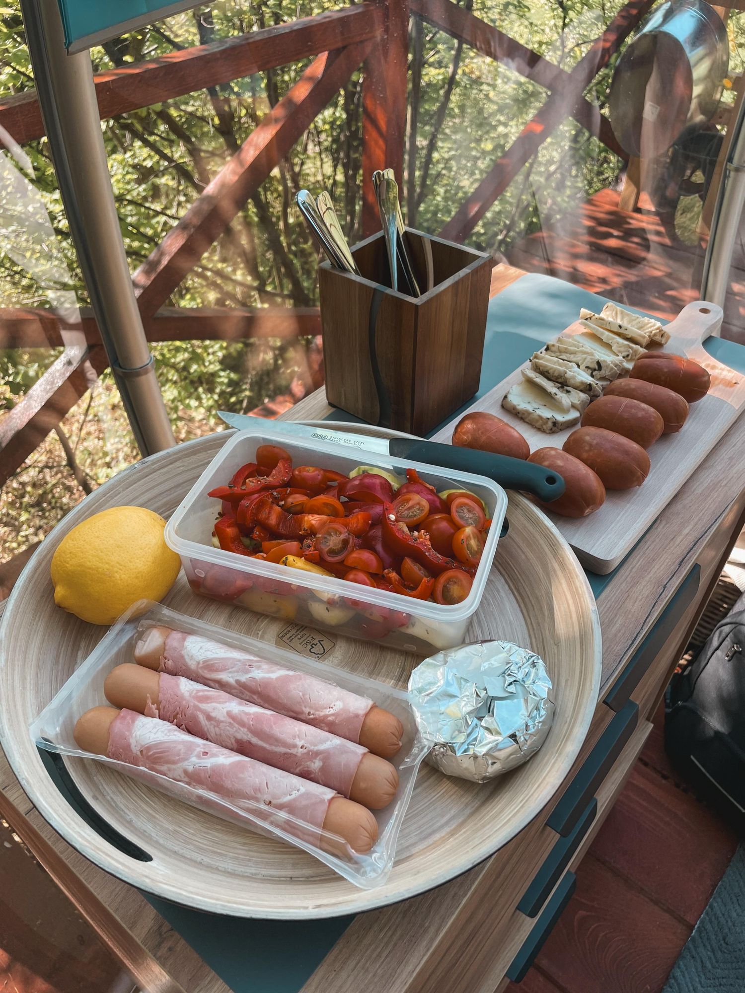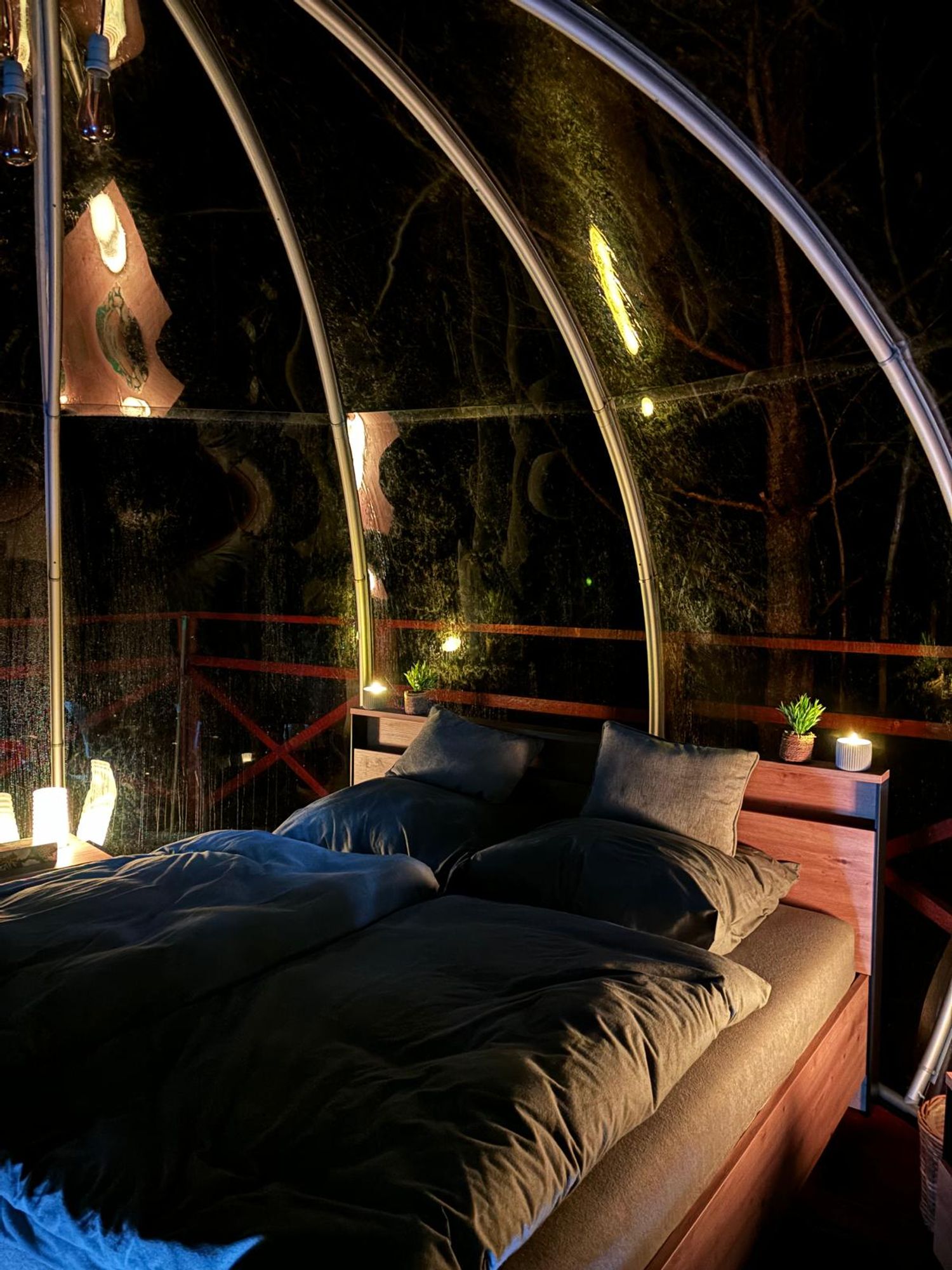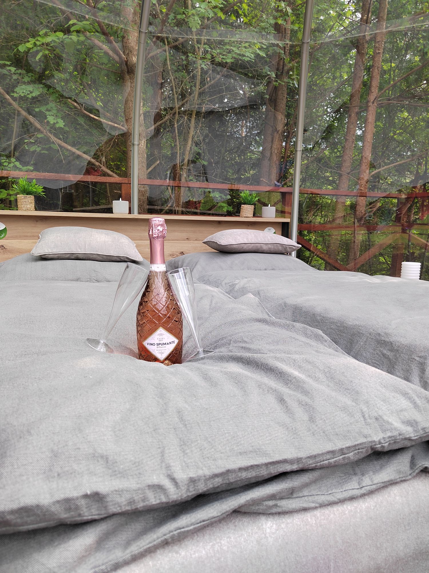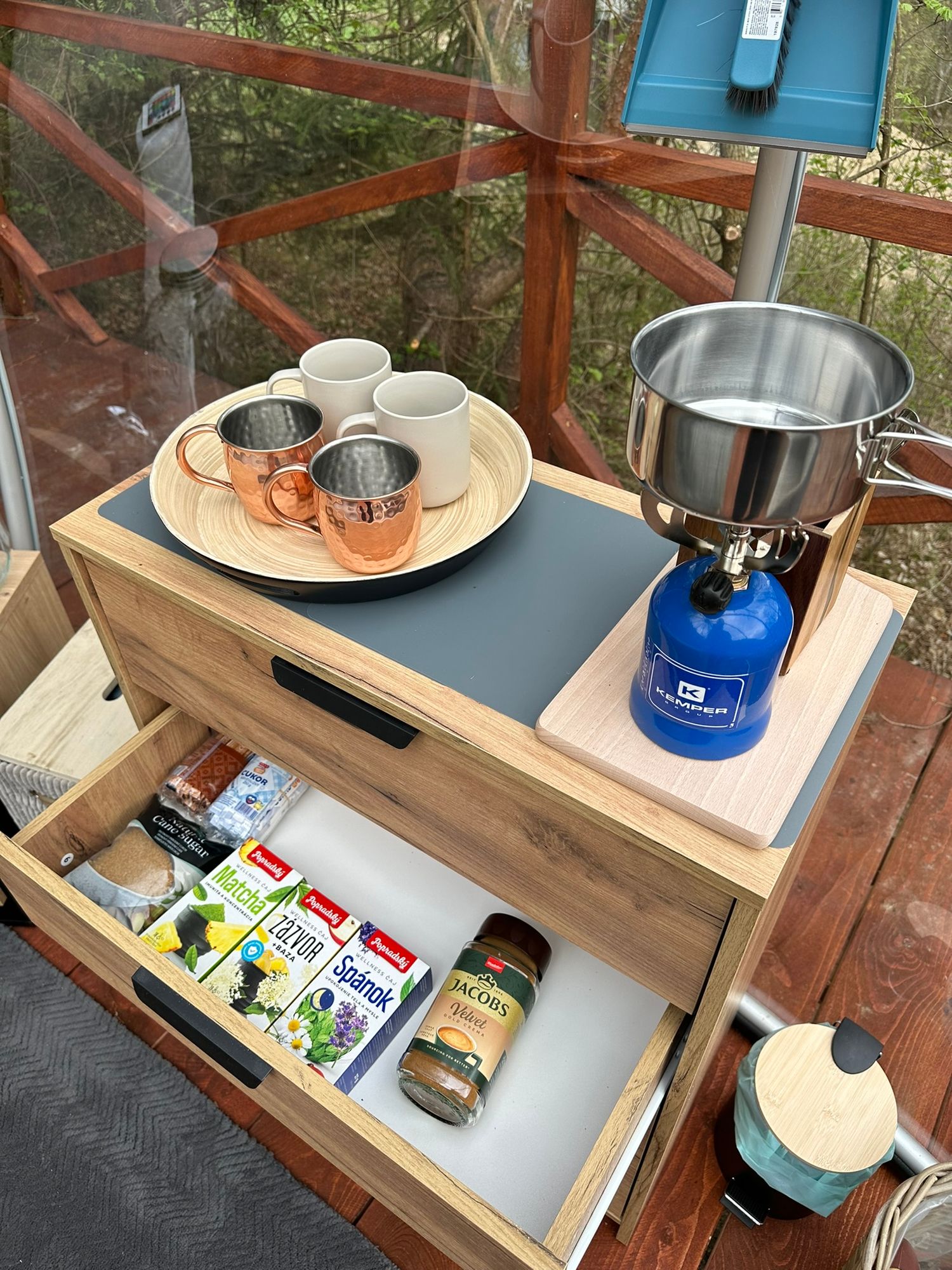Kopula nabízí jednoduché, ale promyšlené zázemí pro pobyt v přírodě. Uvnitř najdete velkou manželskou postel s peřinami a dekami, které vás zahřejí i během chladnějších nocí. Součástí vybavení je také turistický plynový vařič, základní nádobí, lampičky, čelovky nebo společenské hry, aby byl pobyt pohodlný i bez napojení na energie.