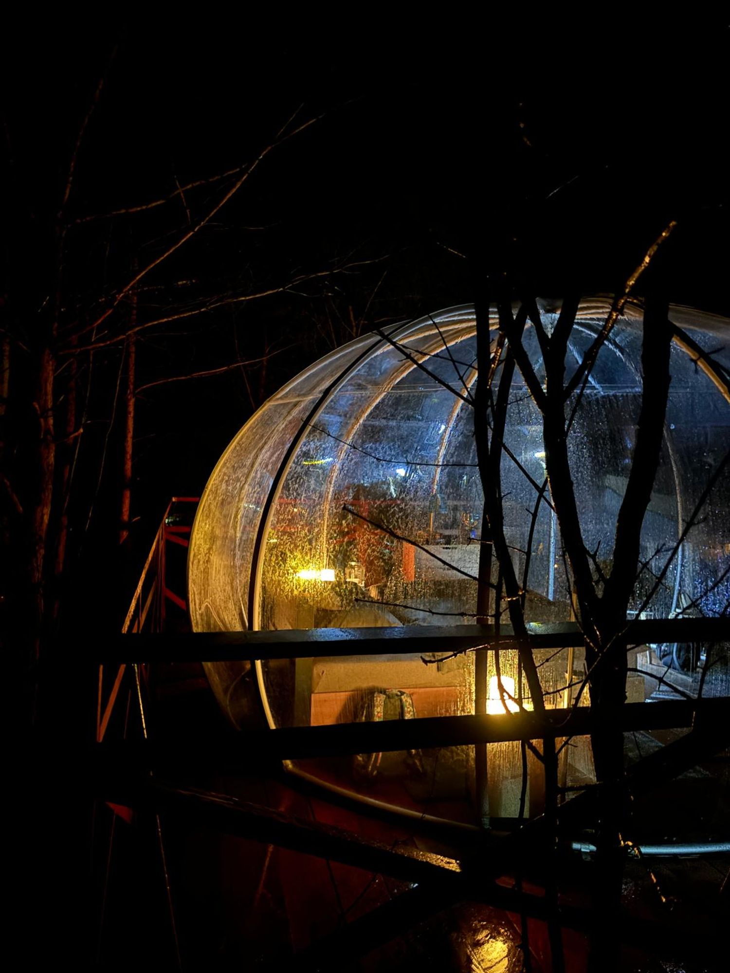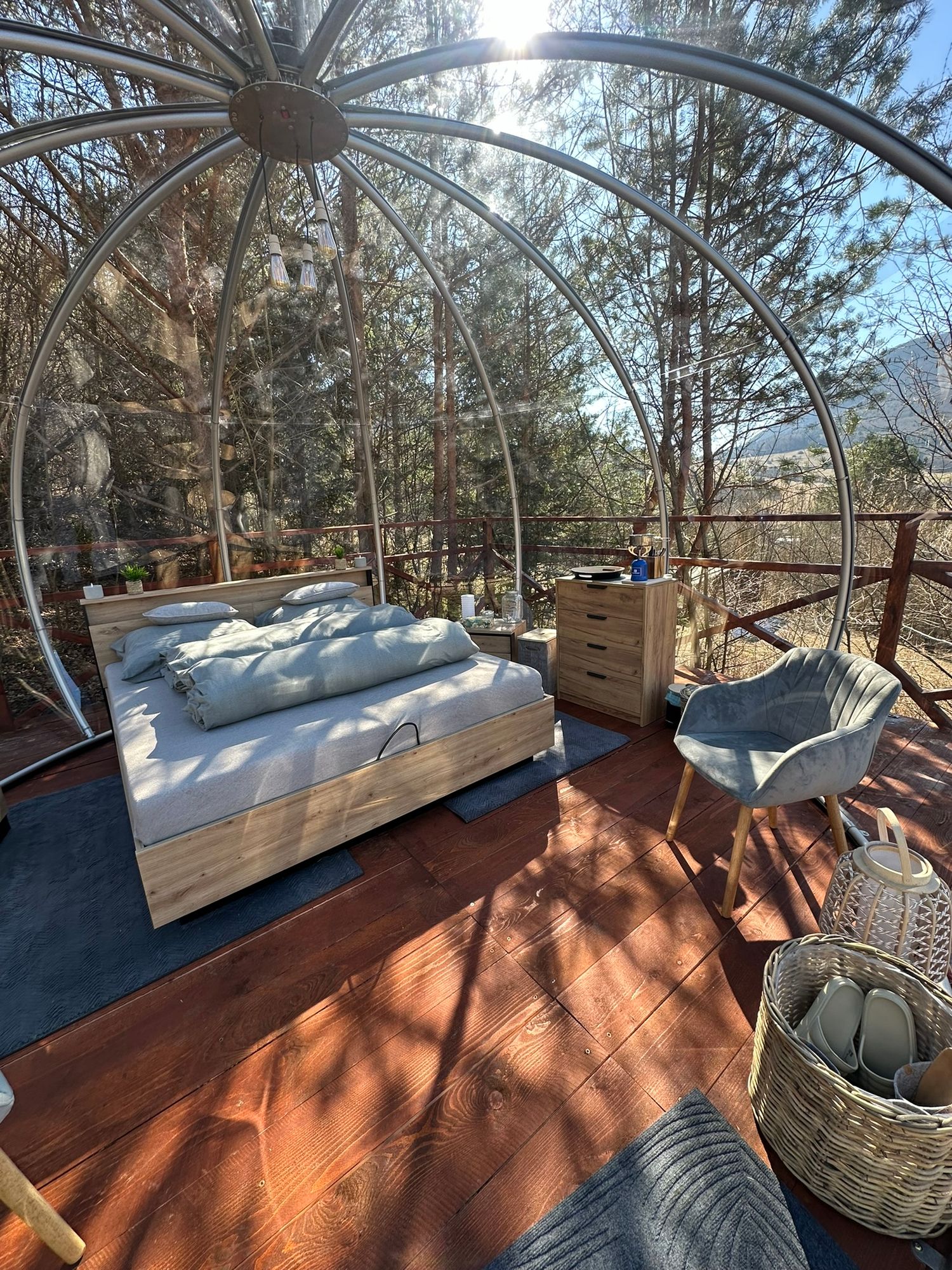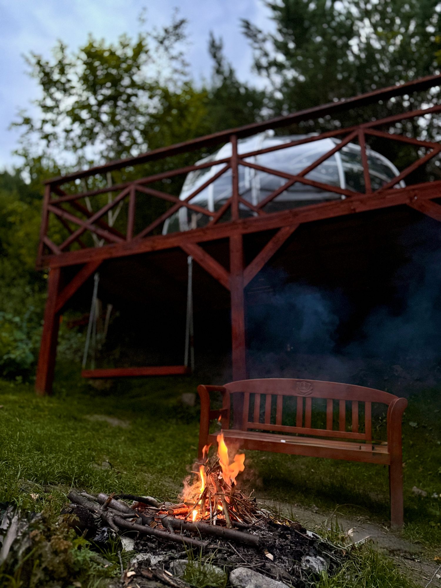 Ubytování není připojeno na elektřinu ani vodu, což je záměr, který umožňuje prožít noc v přírodě trochu jinak než v běžném ubytování. Venku je k dispozici ohniště pro večerní posezení a jednoduchá latrína. Parkování se nachází přibližně kilometr od kopule, poslední část cesty tak vede pěšky přes okolní krajinu.