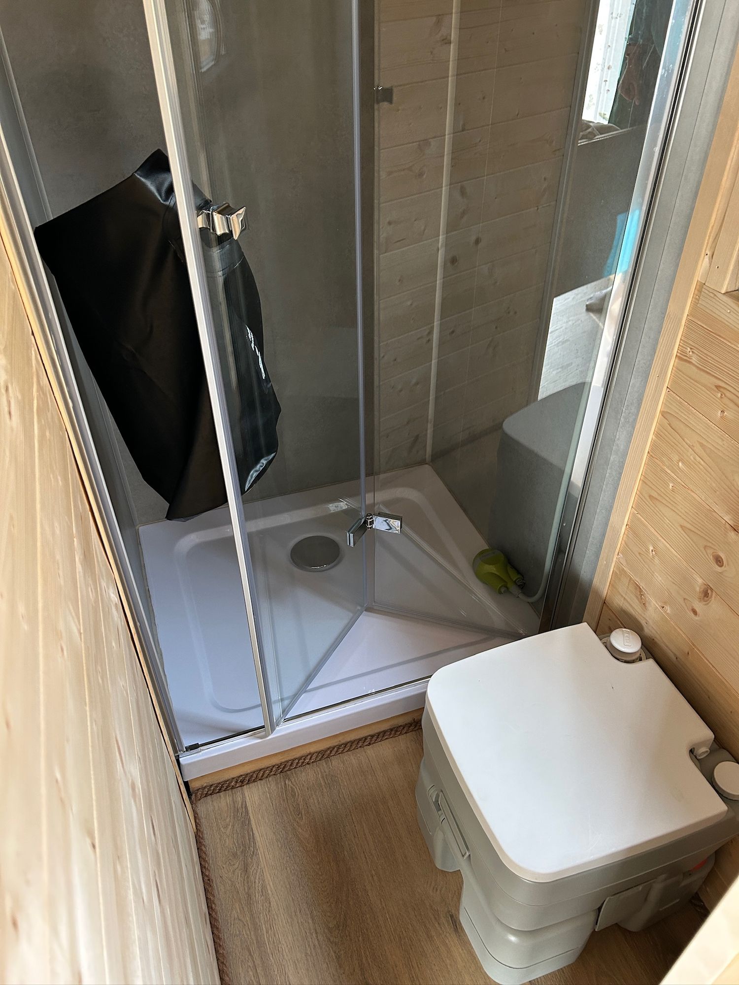 Sanitární vybavení: Malá sprcha a chemické WC zajišťují základní hygienické potřeby hostů.