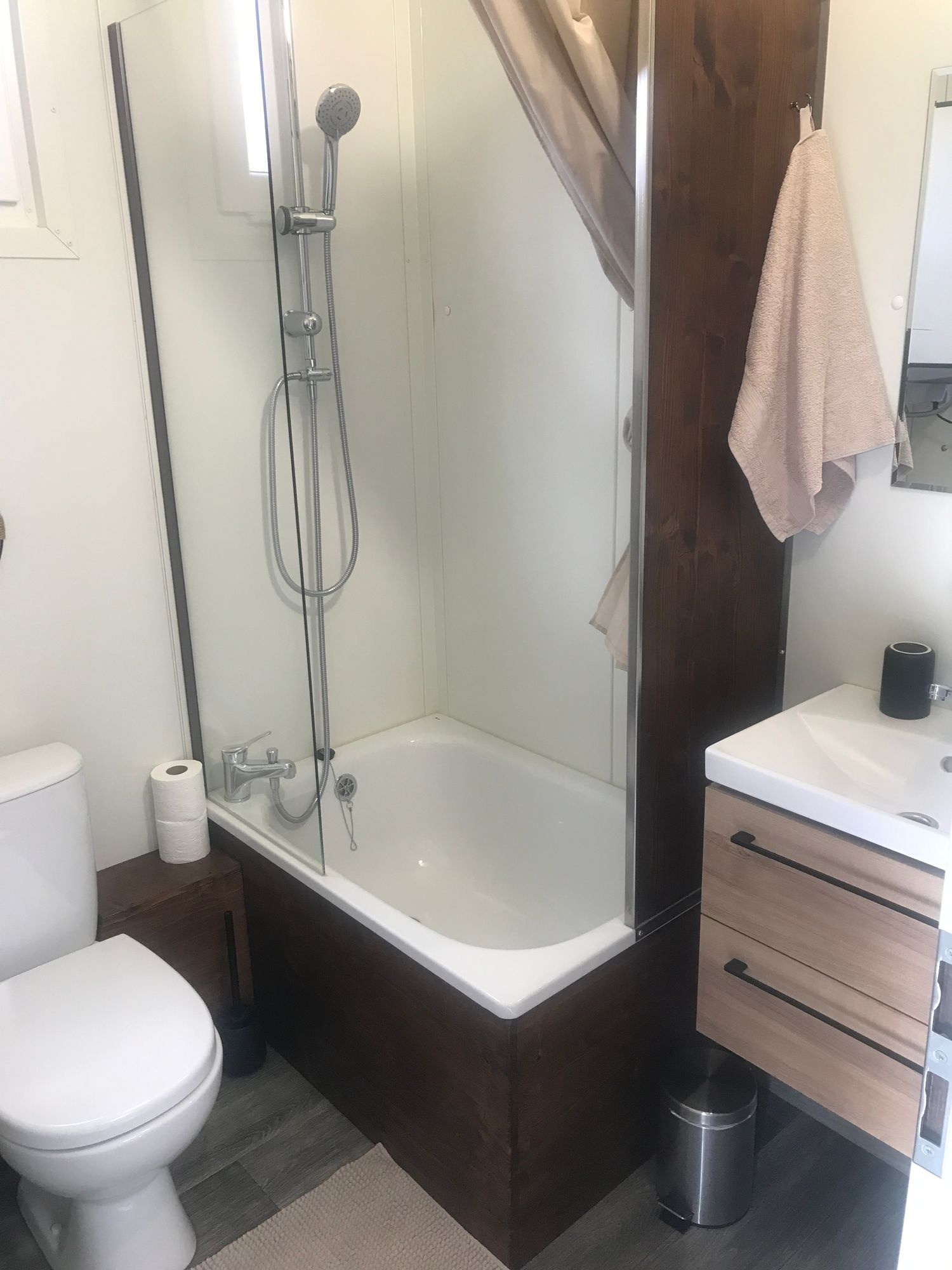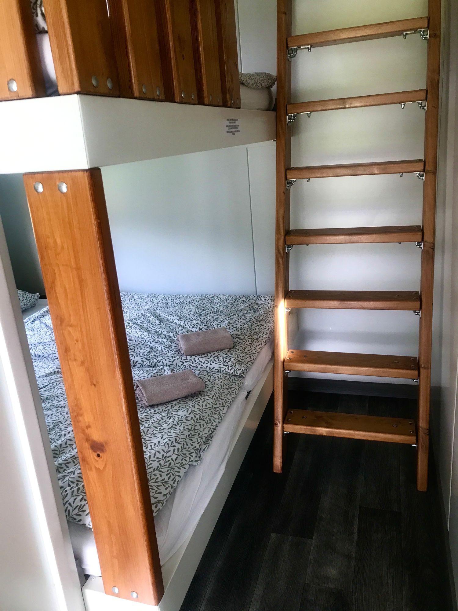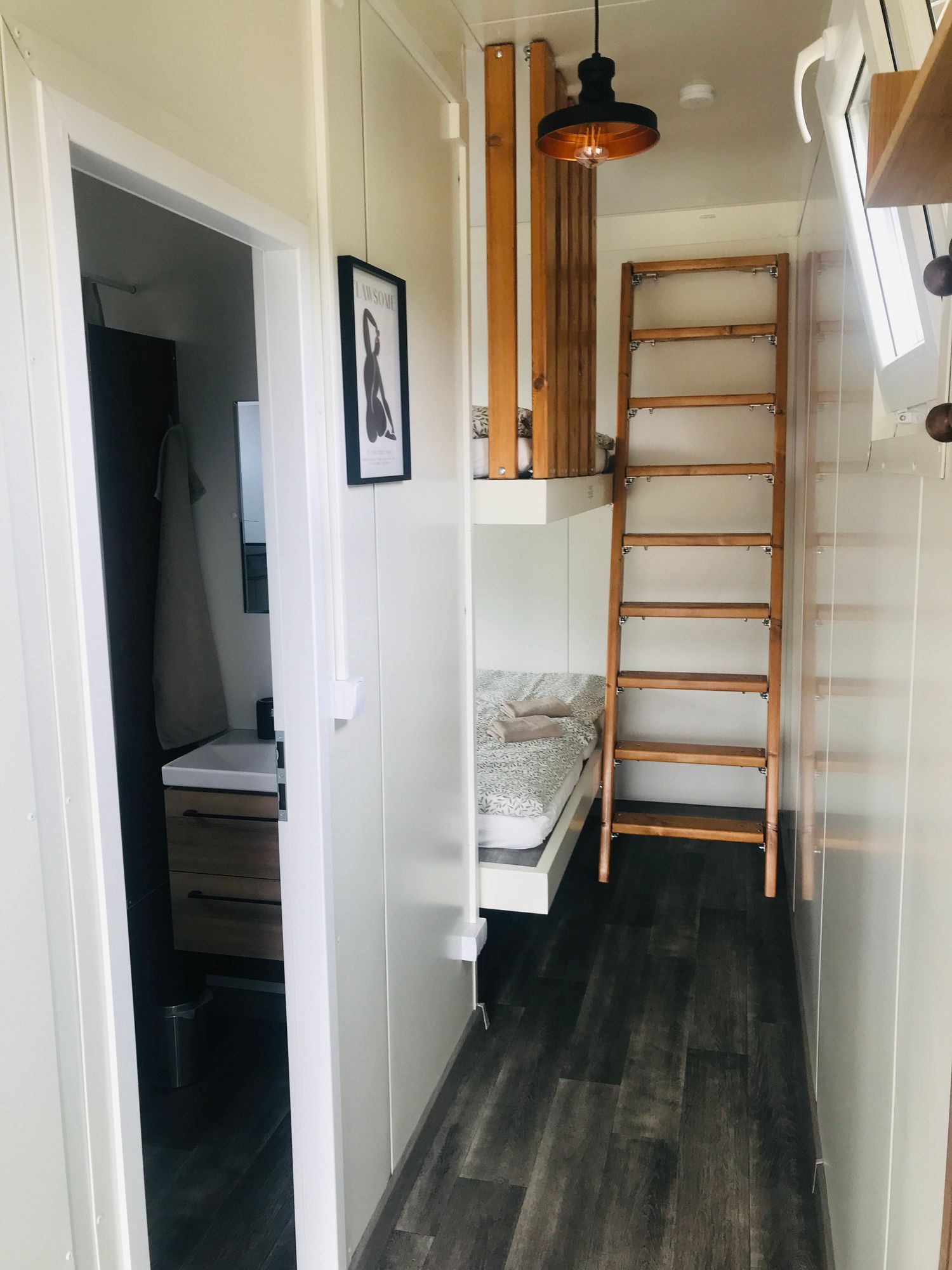 Obytná část s kuchyňským koutem a rozkládací pohovkou tvoří přirozené centrum domku. Spací zóna je řešena ve dvou úrovních, což umožňuje oddělení prostoru a větší soukromí. Součástí je koupelna s vanou, sprchou a WC.